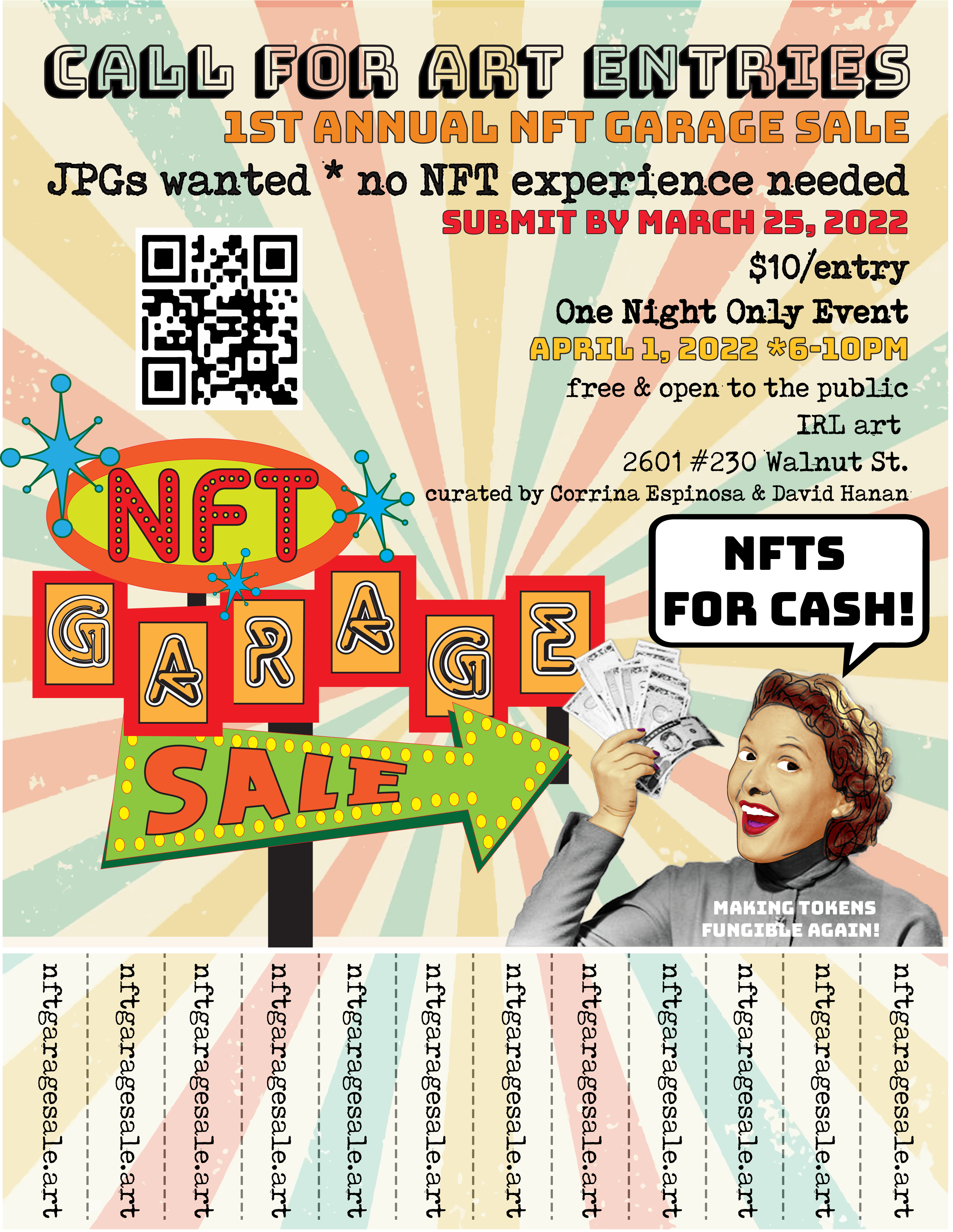 We will be minting all accepted JPGs/PNGs (turning them into NFTs with a general license that can be edited later by the artist) to be sold for CASH at the event. The freshly minted NFTs will be exhibited in rotation on display screens at the event. Once sold they will be digitally transferred to their new owner without the need for cryptocurrency. BOOM. Your token has just been funged.(not technically)